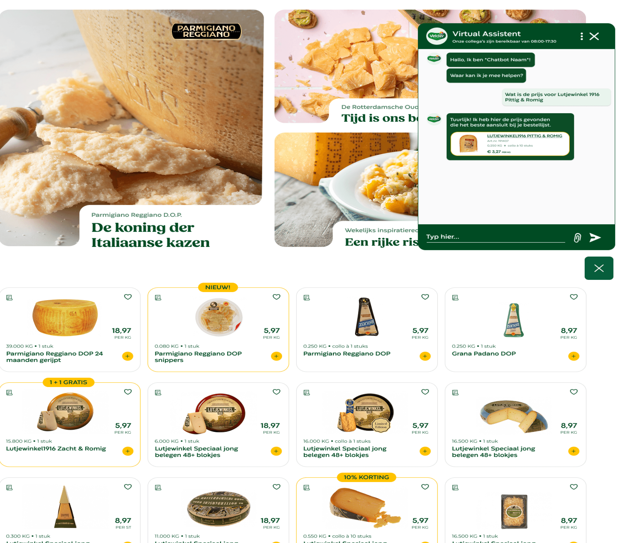 An AI Chatbot designed for Velder’s B2B webshop to solve customer service challenges. The chatbot handles tasks automatically, answers questions, and guides customers within four steps, with a focus on speed, efficiency, and action oriented support.