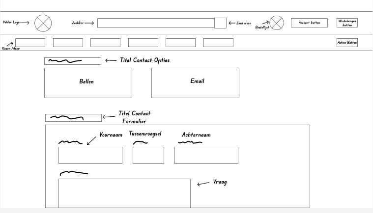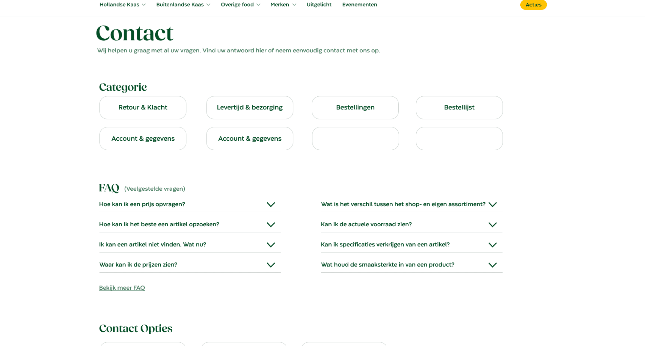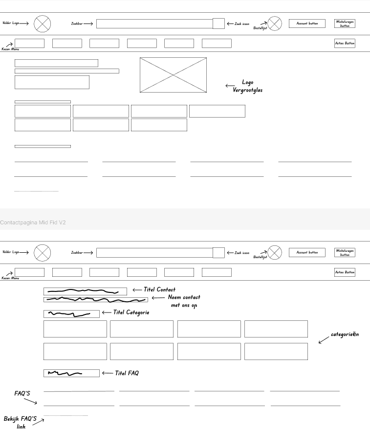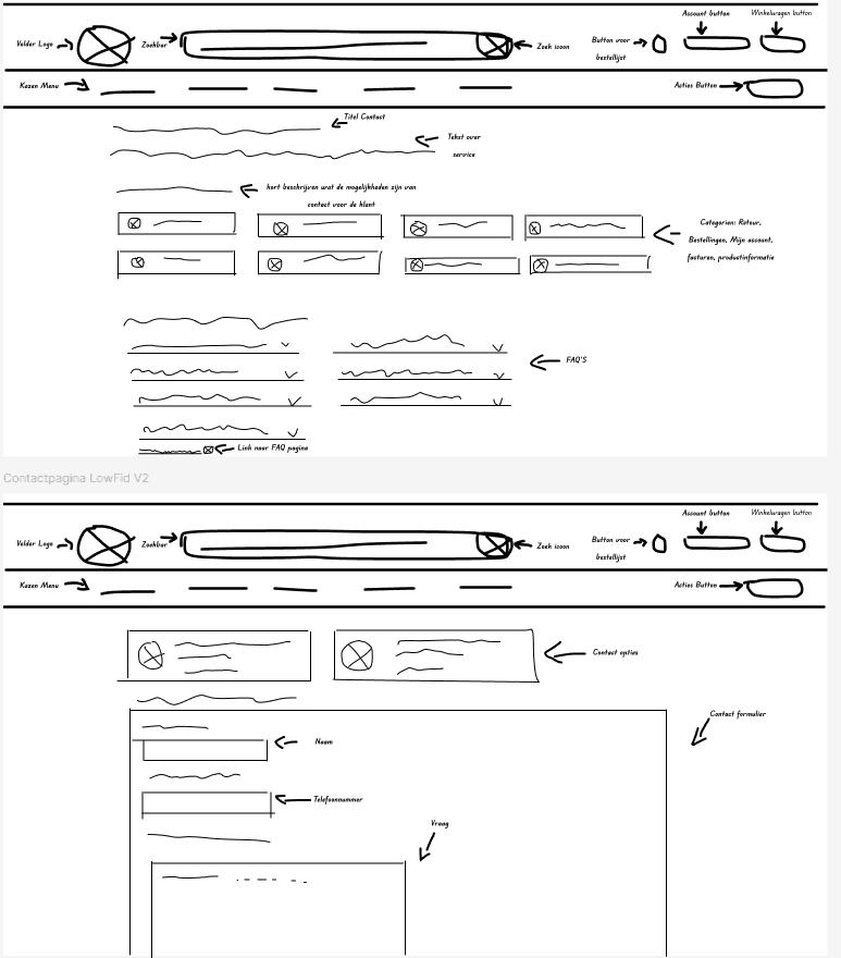 Instead of a large block under the FAQ, I created a link to keep the screen uncluttered, based on team feedback. I also added the Dutch term next to the FAQ title to ensure all webshop users would understand it. For the high-fidelity wireframe, I received feedback that the contact form appeared too dark and didn’t align with the rest of the page, which I adjusted in the final design.