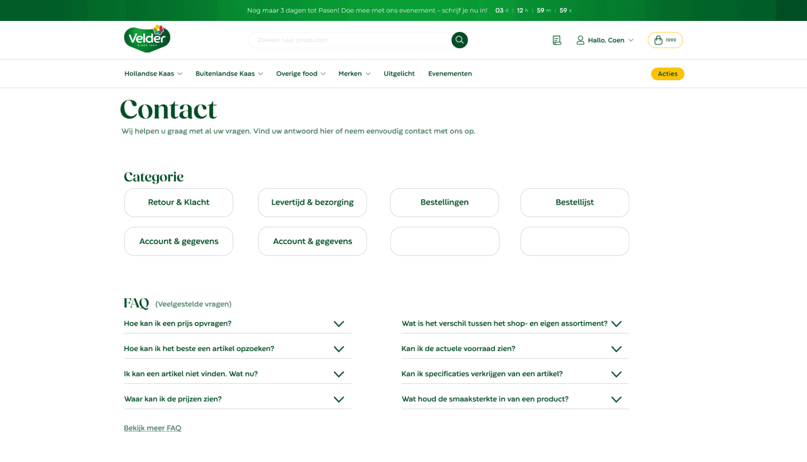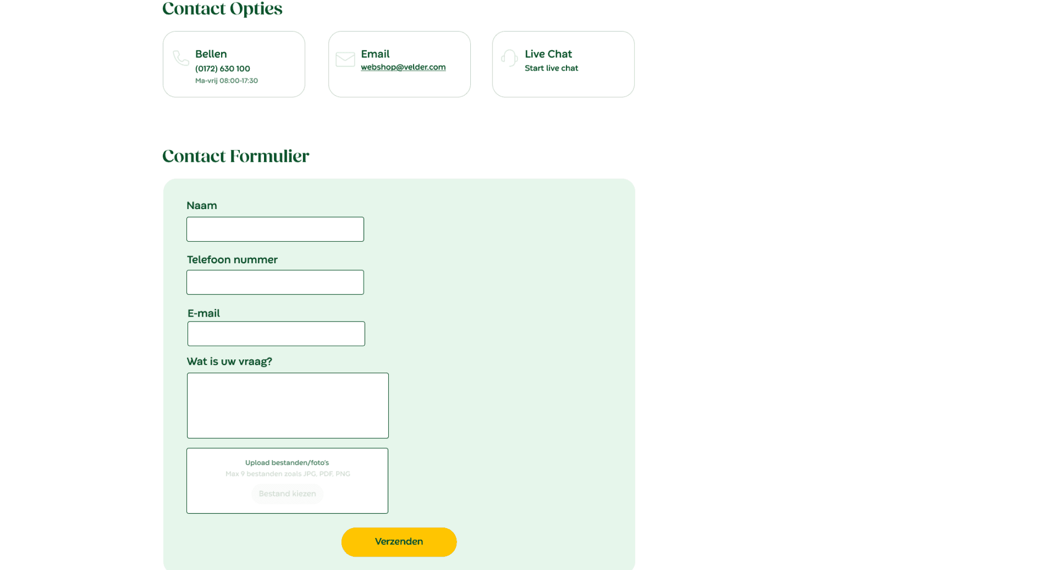 I designed a single page layout so customers can easily find all contact options and key information in one place. The design is clear, consistent with the rest of the website, and guides customers on what to do if they have a question or want to contact Velder.